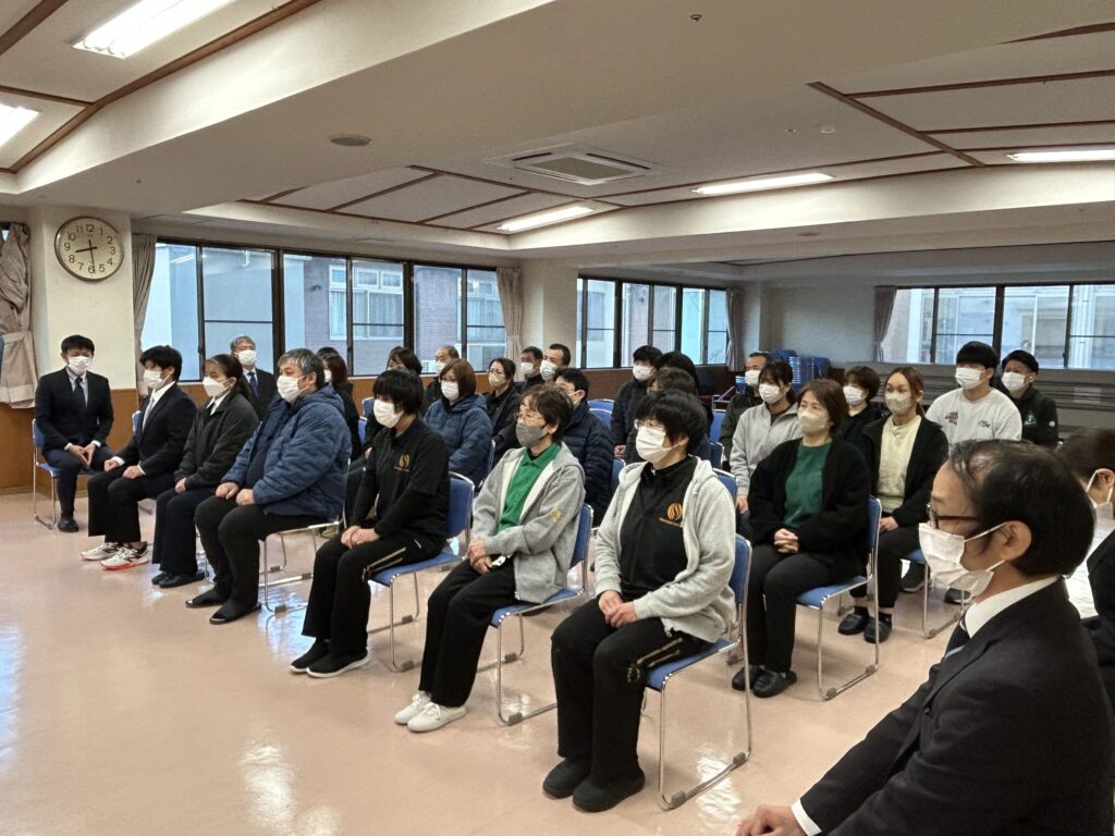 仕事始め式を行いました。理事より訓示をいただき、出席者全員で法人理念を唱和しました。