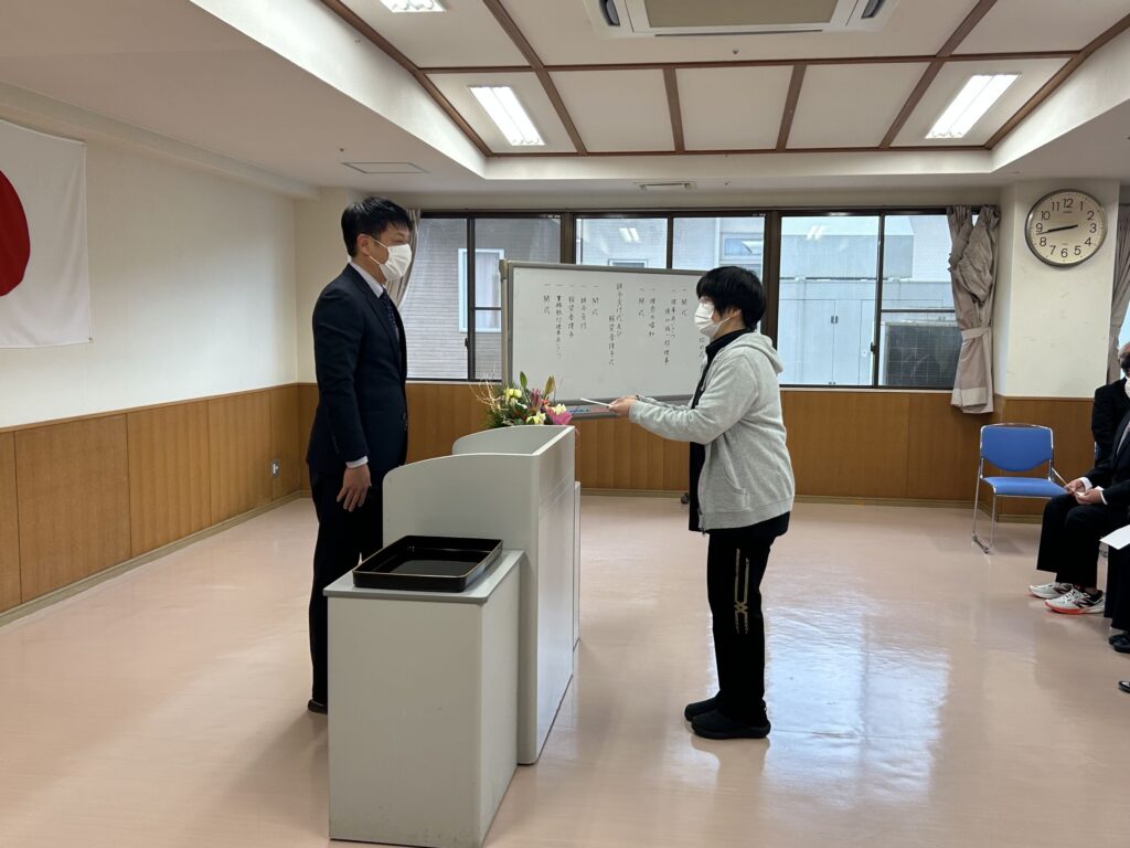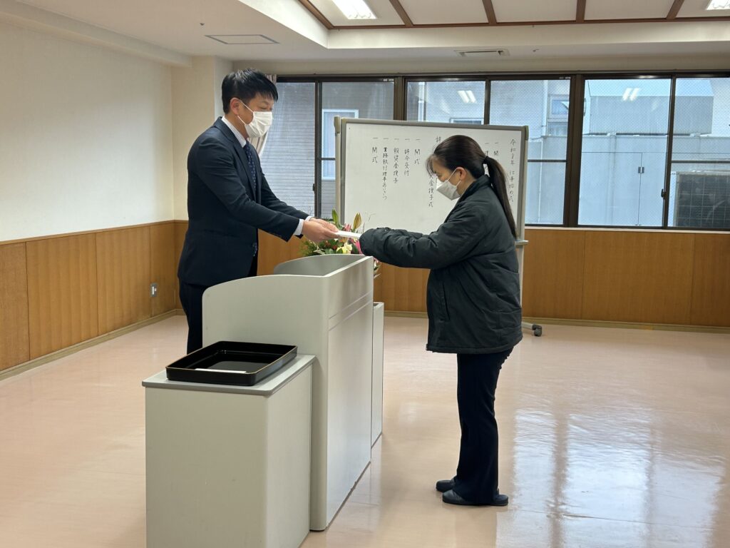 続いて行われた辞令交付式及び報奨金授与式では、2名の職員に辞令が交付された後