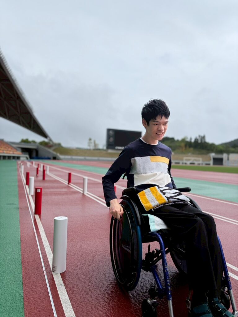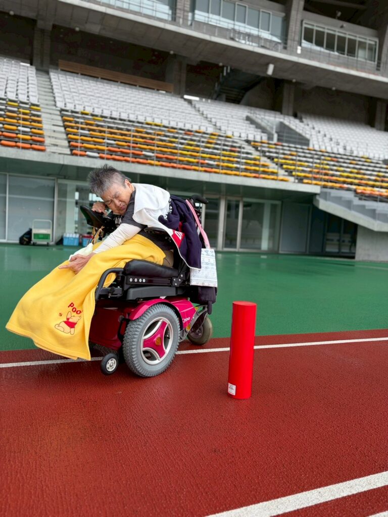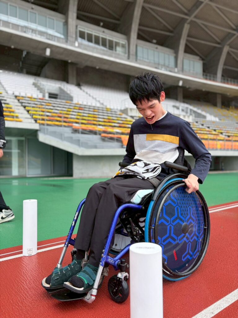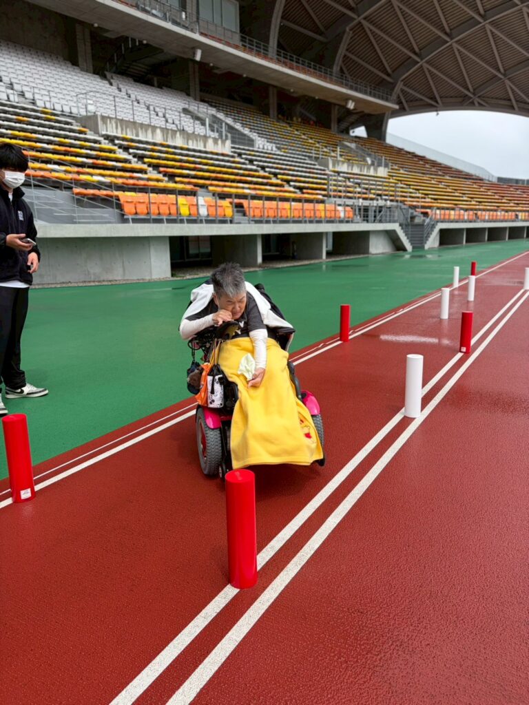 黒霧スタジアムでスラロームと車椅子50メートル走の